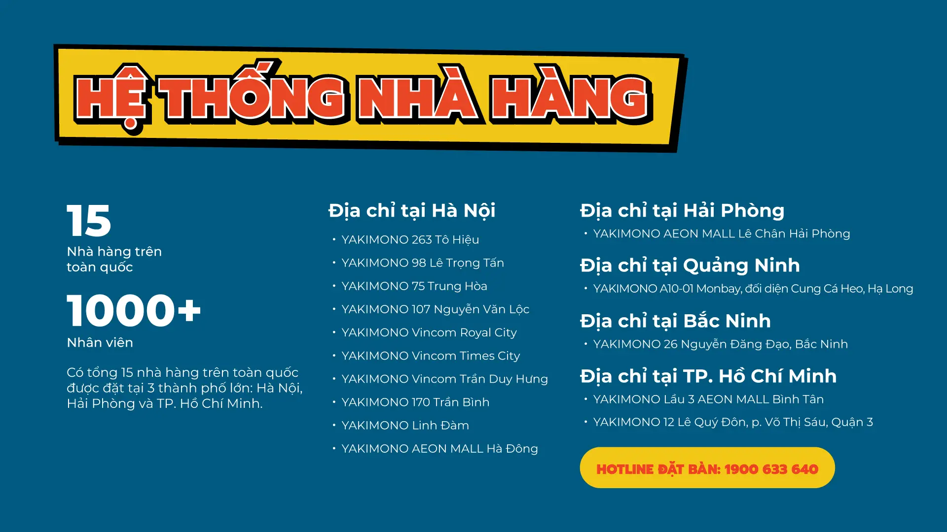 – Yakimono Tô Hiệu, Trần Bình, Trung Hòa, Linh Đàm, Lê Trọng Tấn: T2 – CN (cả ngày)